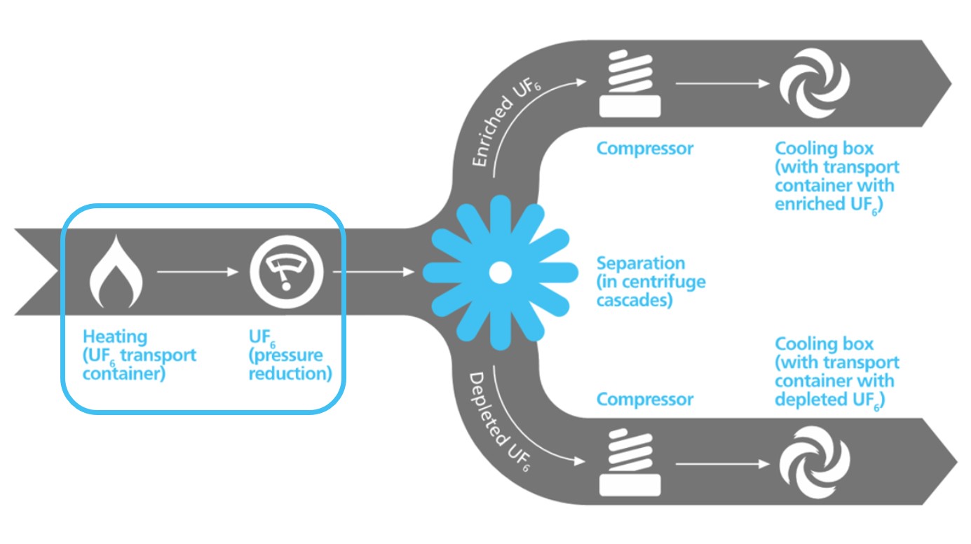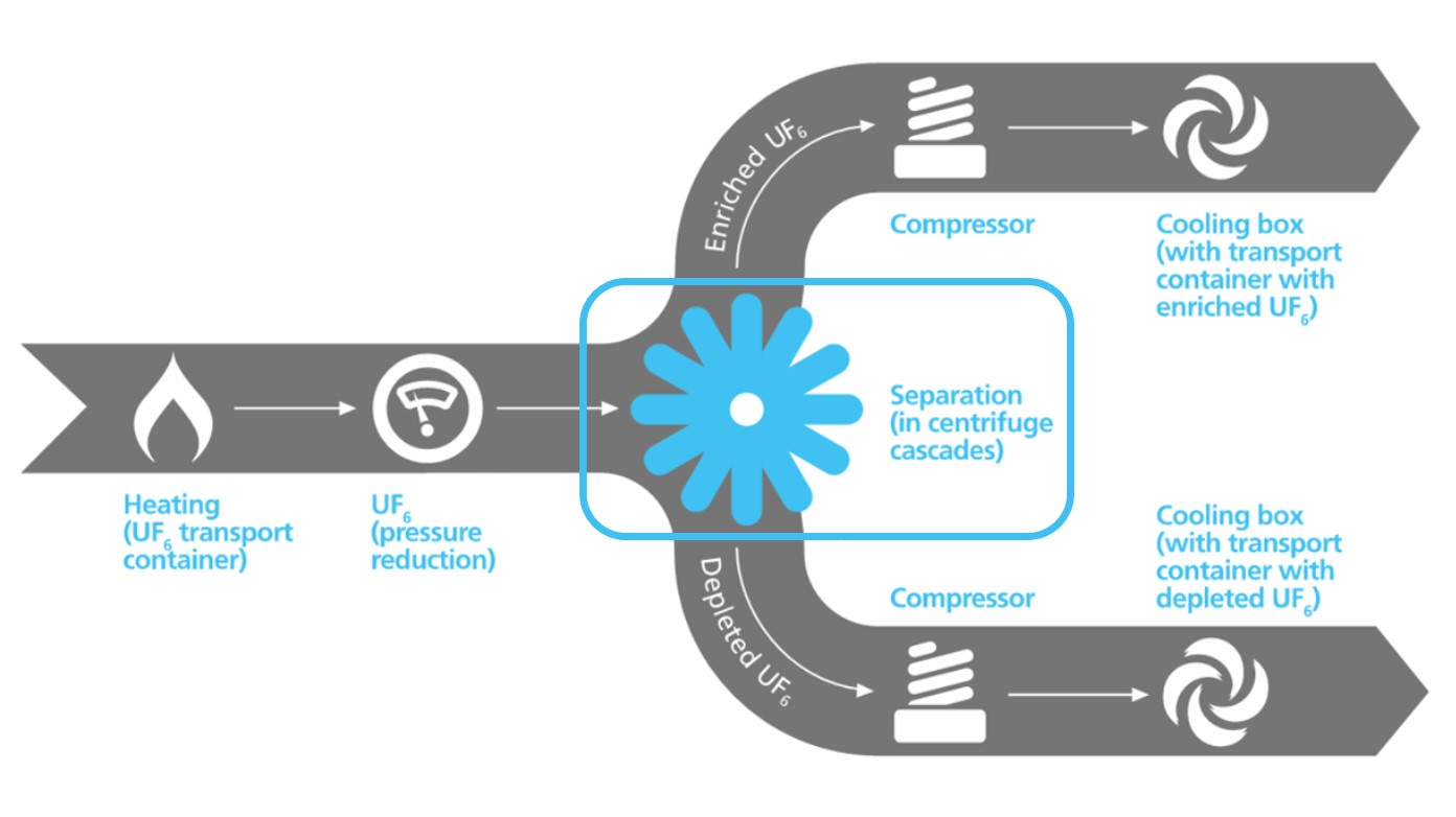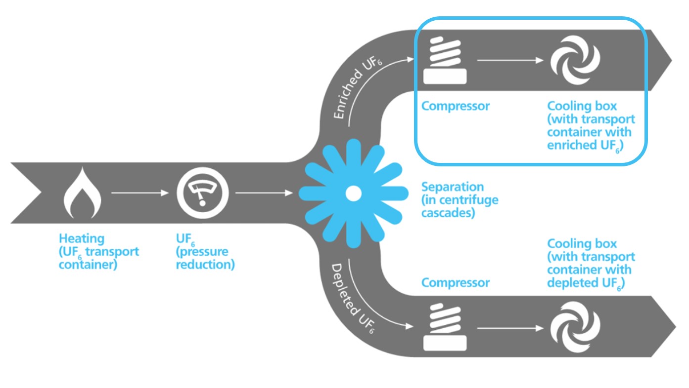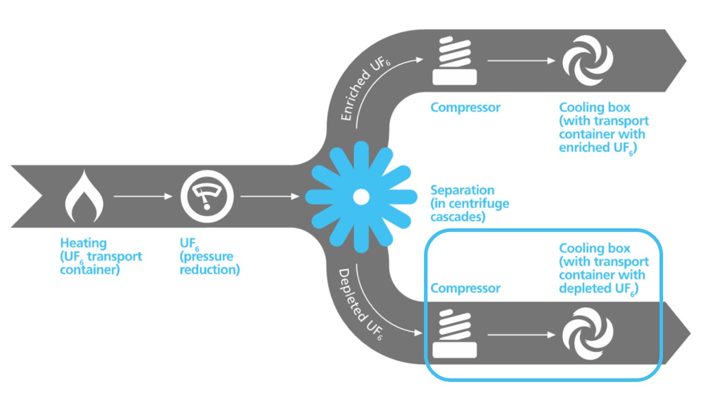 During the enrichment process, the concentration of the U235 isotope in natural uranium is increased from 0.71% to approximately 3-5%. The depleted fraction usually still contains about 20-30% of the initial concentration of U235 and this resource can be re-enriched, which is a common industry practice.